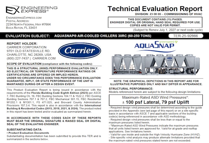 This document is sold as an engineer-certified report for permitting Carrier Aquasnap® Air-Cooled Chillers 30RC (60-250 Tons) Units with the model numbers listed below. The document meets the requirements for structural wind integrity per the selected building code above, using ASCE 7 for structural approval of unit housing and tie-down clip capacities. This report will be signed and sealed by a Professional Engineer of the firm when purchased and delivered to you via email (using the digital seal method, within 24 hours) or mail (UPS Ground for printed and signed hard copies, next day in South Florida). Use it with your site-specific documents to obtain a building permit.