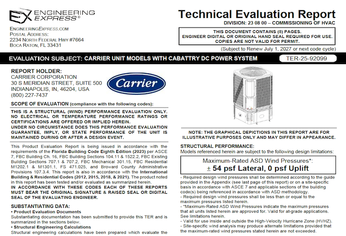 This document is sold as an engineer-certified report for permitting Carrier: Units with Cabattry DC Power System and the model numbers listed below. The document meets the requirements of the structural wind integrity per the selected building code above, using ASCE 7 for the structural approval of unit housing and tie-down clip capacities. This report will be signed and sealed by a Professional Engineer of the firm when purchased and delivered to you via email (using the digital seal method, within 24 hours) or mail (UPS Ground for printed and signed hard copies, next day in South Florida). Use it with your site-specific documents to obtain a building permit.