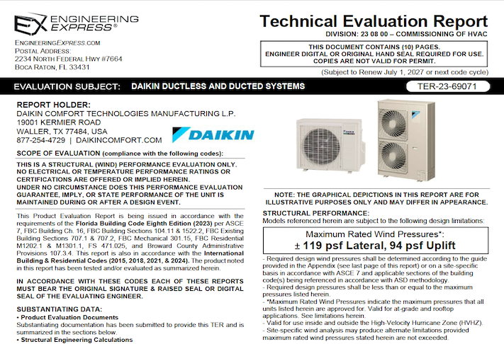 This document is sold as an engineer-certified report for permitting DAIKIN: Ductless and Ducted Systems meeting model numbers listed below. The document meets the requirements of the structural wind integrity per the selected building code above, using ASCE 7 for the structural approval of unit housing and tie-down clip capacities. This report will be signed and sealed by a Professional Engineer of the firm when purchased and delivered to you via email (using the digital seal method, within 24 hours) or mail (UPS Ground for printed and signed hard copies, next day in South Florida). Use it with your site-specific documents to obtain a building permit. (Former TER 20-34269)