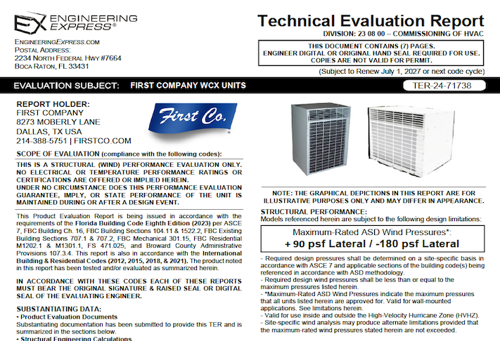 This document is sold as an engineer-certified report for permitting First Company: WCX Units meeting model numbers listed below. The document meets the requirements of the structural wind integrity per the selected building code above using ASCE 7 for the structural approval of unit housing and tie-down clip capacities. This report will be signed and sealed by a Professional Engineer of the firm when purchased and delivered to you via email (using the digital seal method, within 24 hours) or mail (UPS Ground for printed and signed hardcopies, next day in South Florida). Use it with your site-specific documents to obtain a building permit. (Former TER #21-39975)