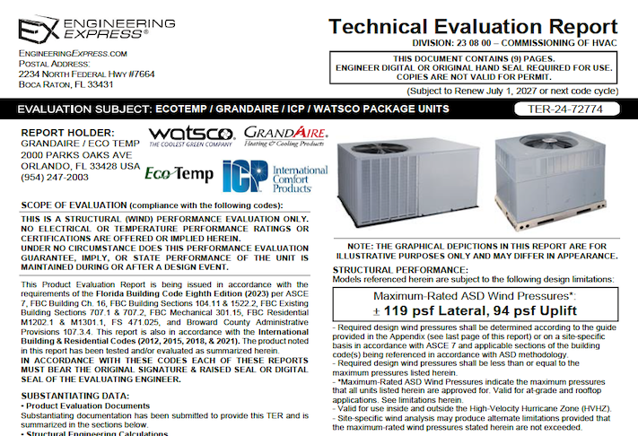 This document is sold as an engineer-certified report for permitting GrandAire / EcoTemp / ICP / Watsco: Package Units meeting model numbers listed below. The document meets the requirements of the structural wind integrity per the selected building code above using ASCE 7 for the structural approval of unit housing and tie-down clip capacities. This report will be signed and sealed by a Professional Engineer of the firm when purchased and delivered to you via email (using the digital seal method, within 24 hours) or mail (UPS Ground for printed and signed hardcopies, next day in South Florida). Use it with your site-specific documents to obtain a building permit. (Former TER #20-33410)