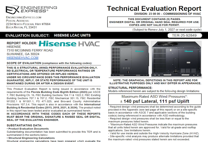 This document is sold as an engineer-certified report for permitting Hisense LCAC Units with the model numbers listed below. The document meets the requirements of the structural wind integrity per the selected building code above using ASCE 7 for the structural approval of unit housing and tie-down clip capacities. This report will be signed and sealed by a Professional Engineer of the firm when purchased and delivered to you via email (using the digital seal method, within 24 hours) or mail (UPS Ground for printed and signed hard copies, next day in South Florida). Use it with your site-specific documents to obtain a building permit.