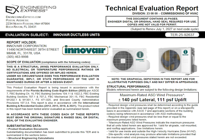 This document is sold as an engineer-certified report for permitting Innovair Corporation’s Innovair Ductless Units with the model numbers listed below. The document meets the requirements for structural wind integrity per the selected building code above, using ASCE 7 for structural approval of unit housing and tie-down clip capacities. This report will be signed and sealed by a Professional Engineer of the firm when purchased and delivered to you via email (using the digital seal method, within 24 hours) or mail (UPS Ground for printed and signed hard copies, next day in South Florida). Use it with your site-specific documents to obtain a building permit.