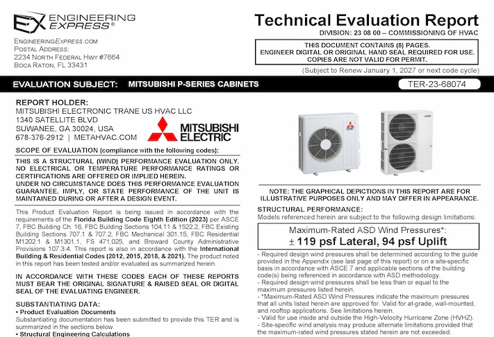 This document is sold as an engineer-certified report for permitting Mitsubishi Electric: P-Series Cabinet Units meeting model numbers listed below. The document meets the requirements of the structural wind integrity per the selected building code above using ASCE 7 for the structural approval of unit housing and tie-down clip capacities. This report will be signed and sealed by a Professional Engineer of the firm when purchased and delivered to you via email (using the digital seal method, within 24 hours) or mail (UPS Ground for printed and signed hardcopies, next day in South Florida). Use it with your site-specific documents to obtain a building permit. (Former TER #20-34964)