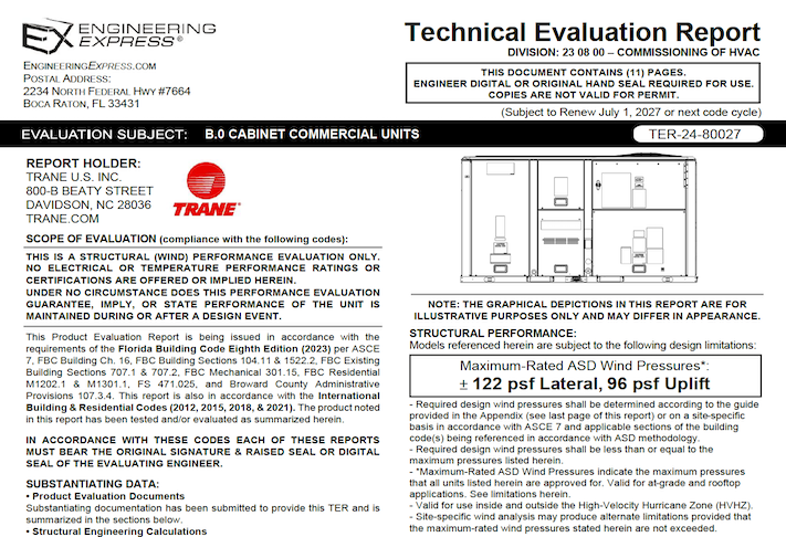 This document is sold as an engineer-certified report for permitting Trane: B.0 Cabine Commercial Units to meet the model numbers below. The document meets the requirements of the structural wind integrity per the selected building code above using ASCE 7 for the structural approval of unit housing and tie-down clip capacities. This report will be signed and sealed by a Professional Engineer of the firm when purchased and delivered to you via email (using the digital seal method, within 24 hours) or mail (UPS Ground for printed and signed hardcopies, next day in South Florida). Use it with your site-specific documents to obtain a building permit.