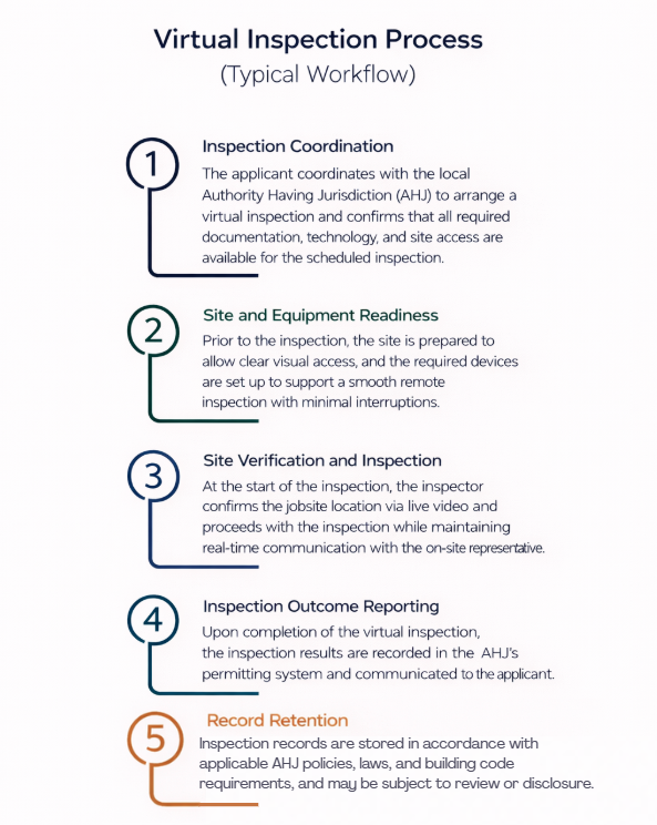 Outside Florida, most U.S. states do not have statewide statutes that explicitly authorize or prohibit virtual inspections. Instead, acceptance is generally governed at the local level, through building department policies, administrative interpretations of adopted building codes (such as the IBC and IRC), or inspection programs adopted by individual cities or counties. National guidance, including from the U.S. Department of Energy, confirms that Authority Having Jurisdiction (AHJ) determines whether and how virtual inspections may be implemented.